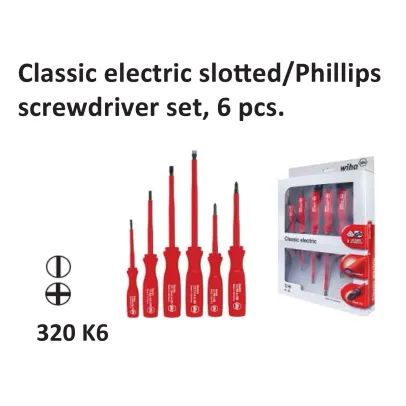 Classic electric slotted/Phillips screwdriver set, 6 pcs. Individually tested protective insulation 1,000 V AC, VDE and GS tested.
